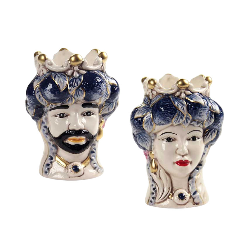 Descrizione: Una coppia di Teste di Moro è un oggetto decorativo tipico della Sicilia, realizzato in ceramica smaltata. Rappresenta due profili, solitamente un uomo e una donna, con tratti somatici che richiamano l'aspetto dei mori. Questi vasi, oltre ad avere una funzione ornamentale, simboleggiano l'amore, la passione e la gelosia, ispirandosi a una leggenda popolare siciliana.