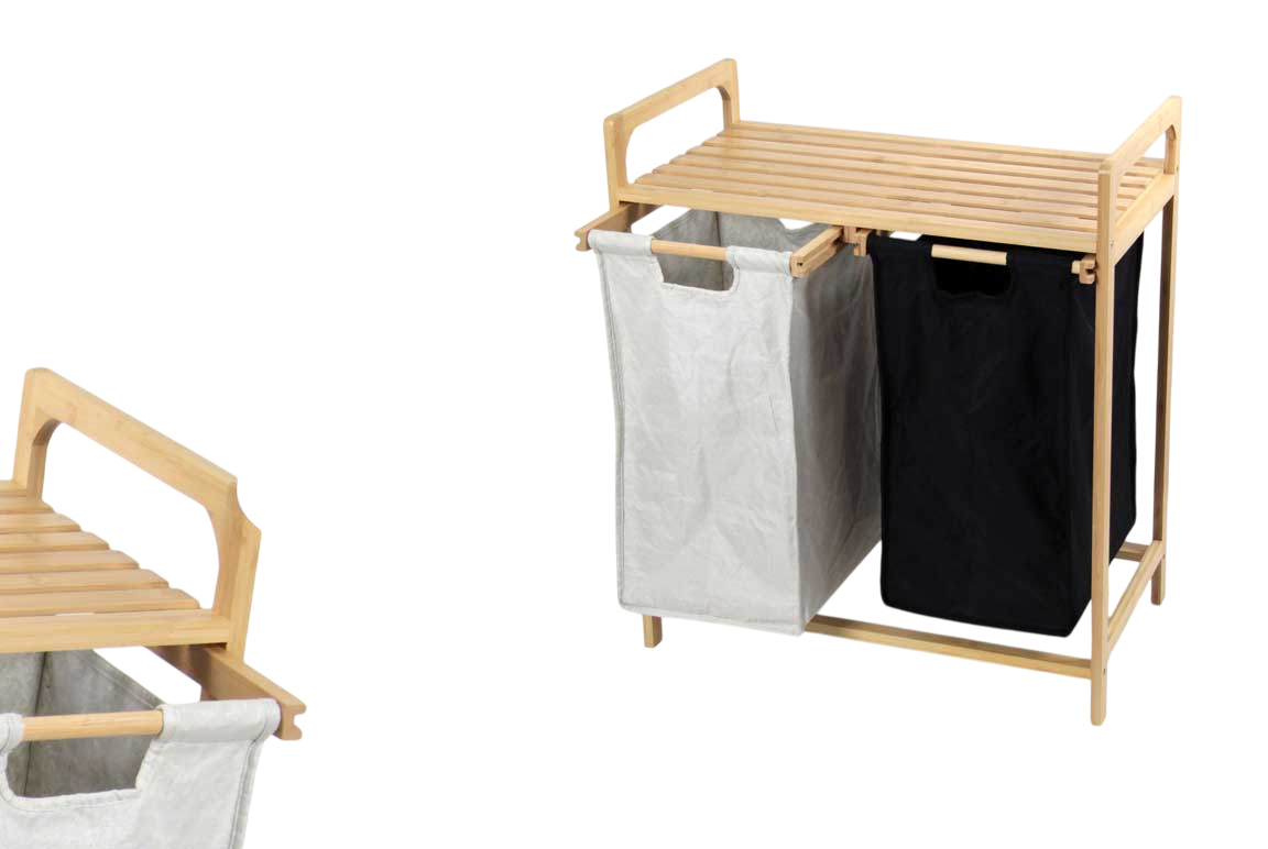 Descrizione: Organizza il bucato con stile grazie a questo pratico portabiancheria a due scomparti. La struttura è realizzata in bamboo naturale, resistente e leggero, che aggiunge un tocco di eleganza e calore all'ambiente. I due sacchi interni in tessuto (poliestere) permettono di separare facilmente i capi scuri da quelli chiari o i delicati, rendendo più semplice la gestione del bucato.