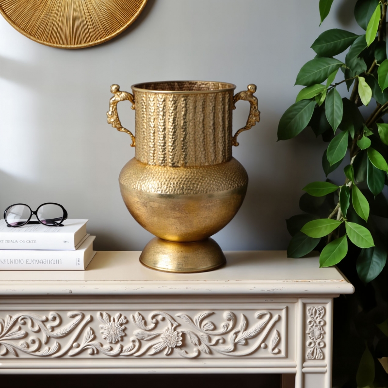 Descrizione: Realizzata in metallo color oro lucente, questa anfora non è solo un vaso, ma un vero e proprio pezzo d'arredo che cattura la luce e l'attenzione. La sua forma ispirata all'antichità conferisce stabilità e un tocco di lusso senza tempo a qualsiasi ambiente.
