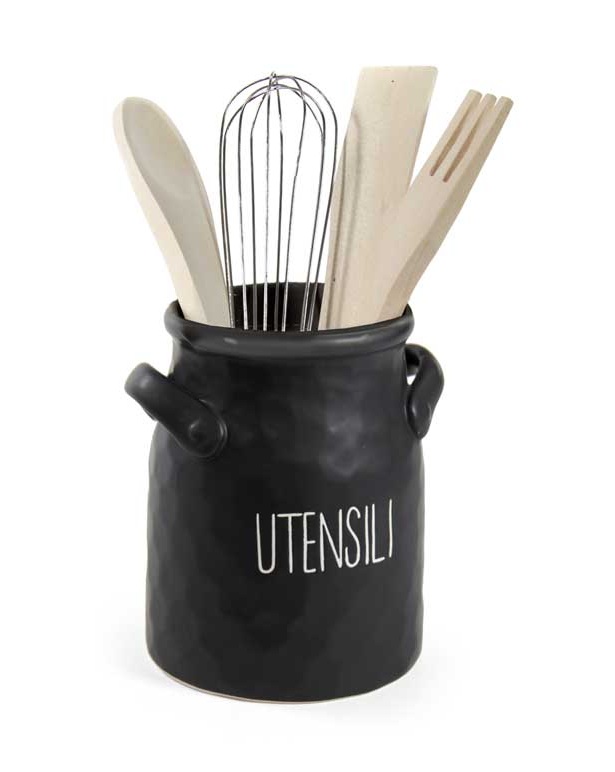 Descrizione: Set portautensili in ceramica nero con utensili in legno.