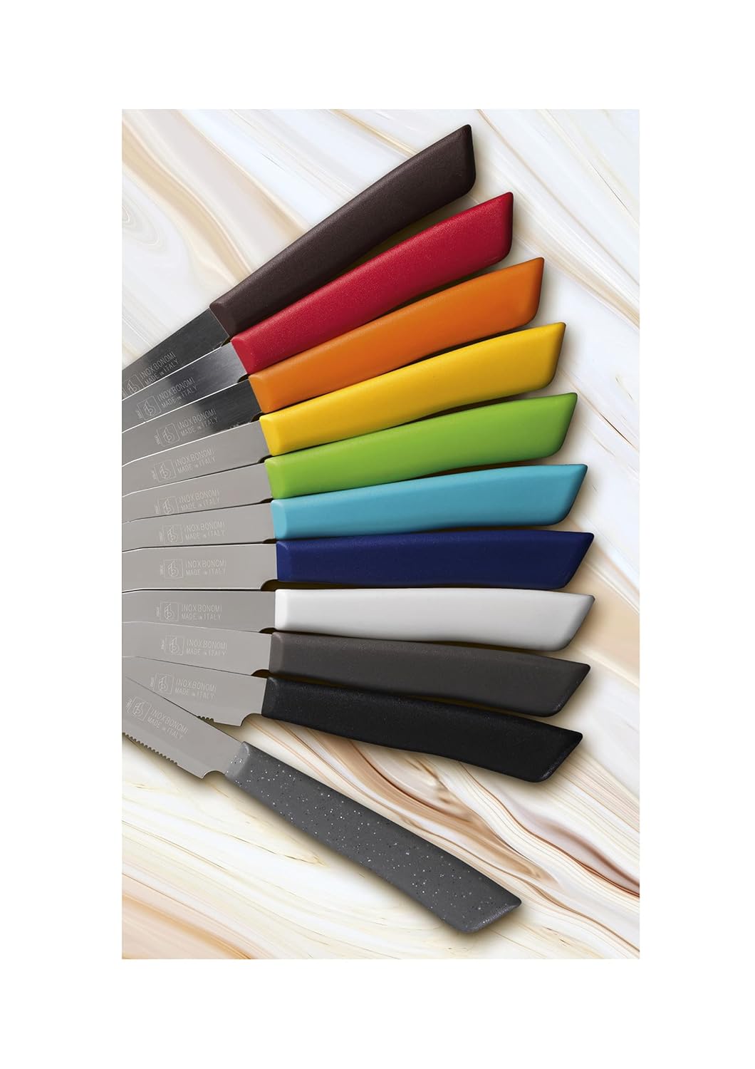 Descrizione: Rinnova la tua tavola con questo set di 6 coltelli di alta qualità, progettati per unire resistenza e stile. Realizzati in acciaio inossidabile 18/C (senza nichel), garantiscono un taglio preciso e un’ottima durata nel tempo. Il manico in resina termoplastica offre una presa ergonomica e sicura, aggiungendo un tocco di eleganza moderna a ogni mise en place.