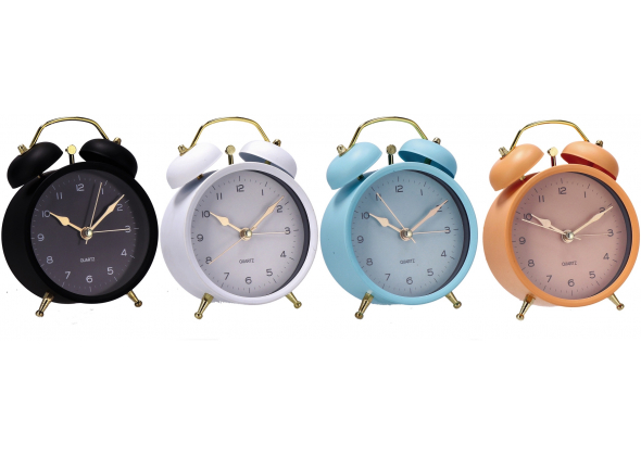 Descrizione: Orologio sveglia in ferro--ass. 4 colori--cm. 9,5 x 5,5 x h. cm. 13,5