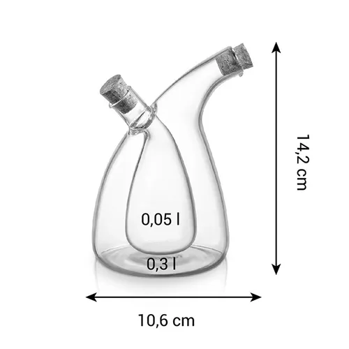 Descrizione: Scopri la combinazione perfetta per olio e aceto: la bottiglia doppia Virgo è progettata per offrirti la massima praticità in cucina e a tavola. Il suo design particolare ed elegante include nel contenitore per l’olio in vetro borosilicato da 300 ml, uno più piccolo per l’aceto, da 50 ml, entrambi con tappi in sughero di alta qualità che dona una nota naturale e garantisce la migliore conservazione dei condimenti.