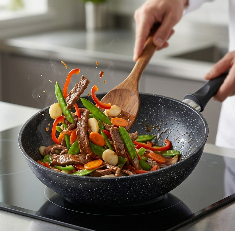 Descrizione: Rinnova la tua cucina con questo Wok di alta qualità, ideale per cotture saltate e ricette orientali. Il rivestimento antiaderente rinforzato effetto pietra garantisce una cucina sana con pochi grassi e una pulizia ultra rapida. Il corpo profondo in alluminio assicura una diffusione del calore uniforme, mentre il manico ergonomico offre una presa sicura e confortevole.