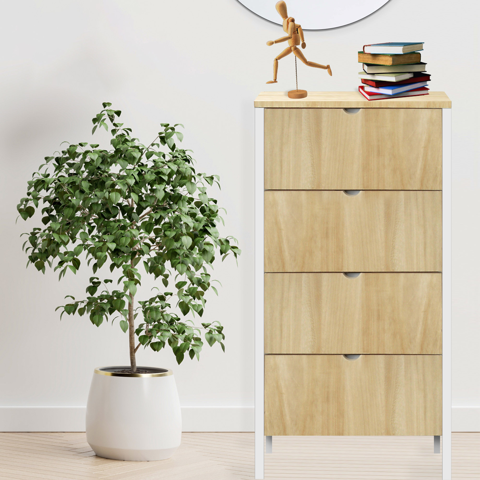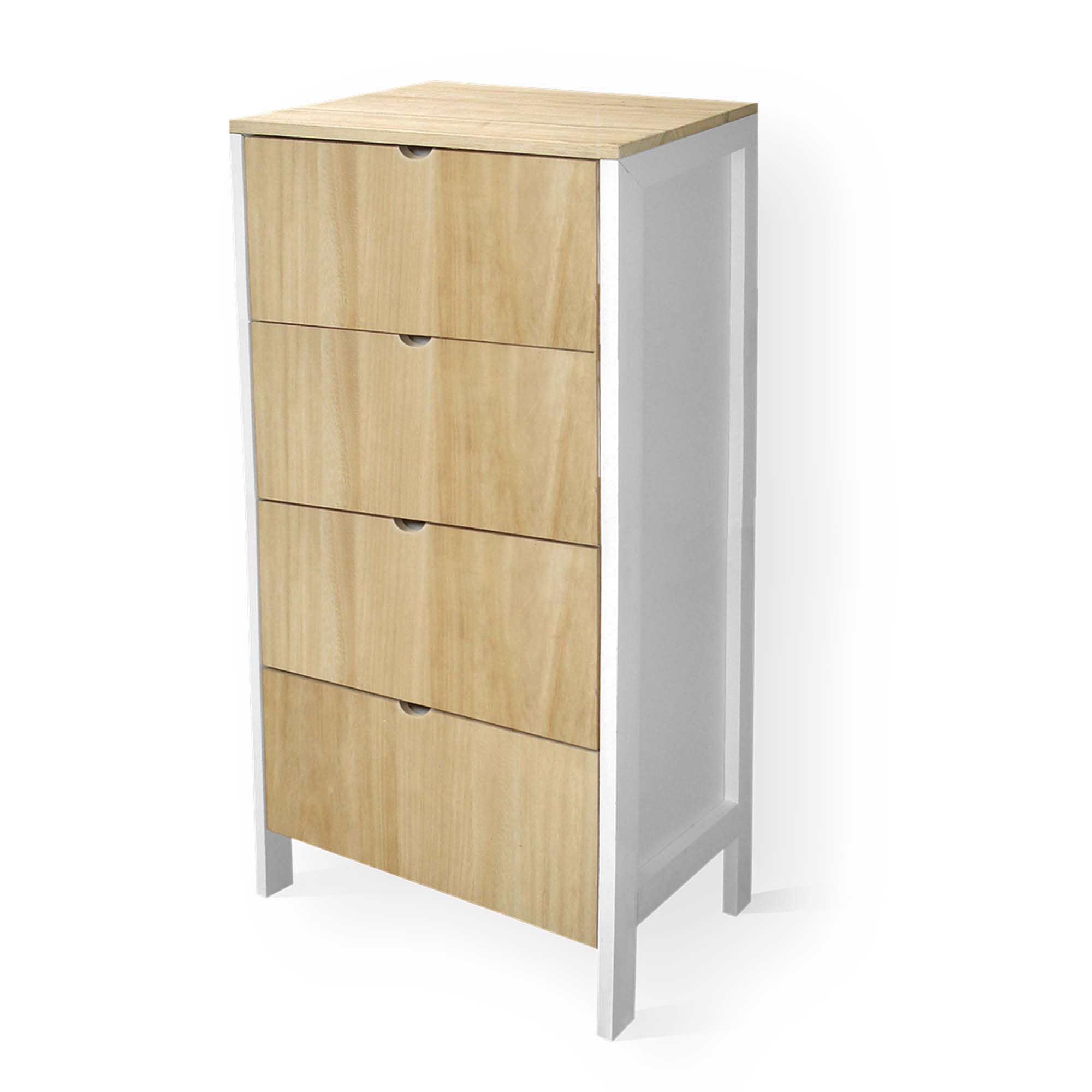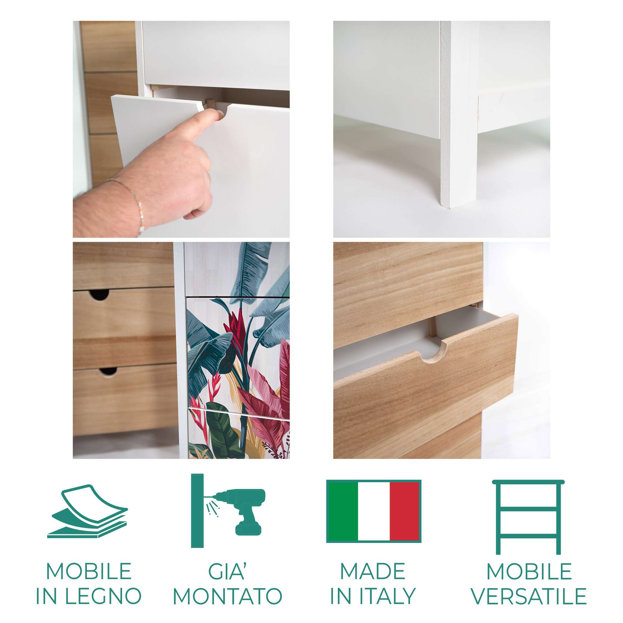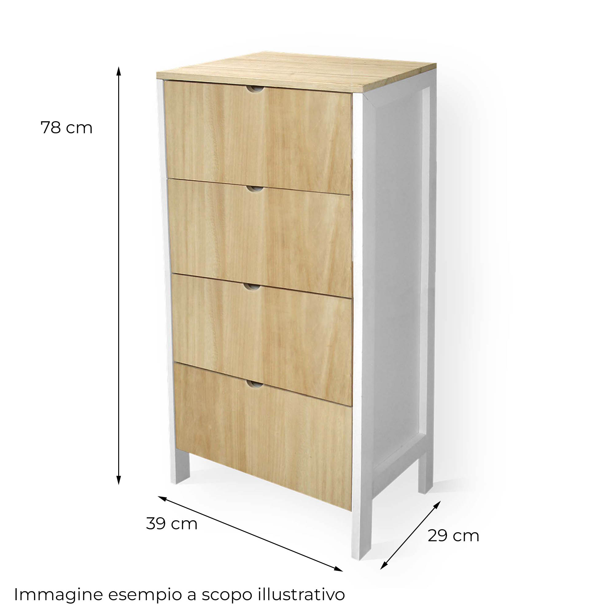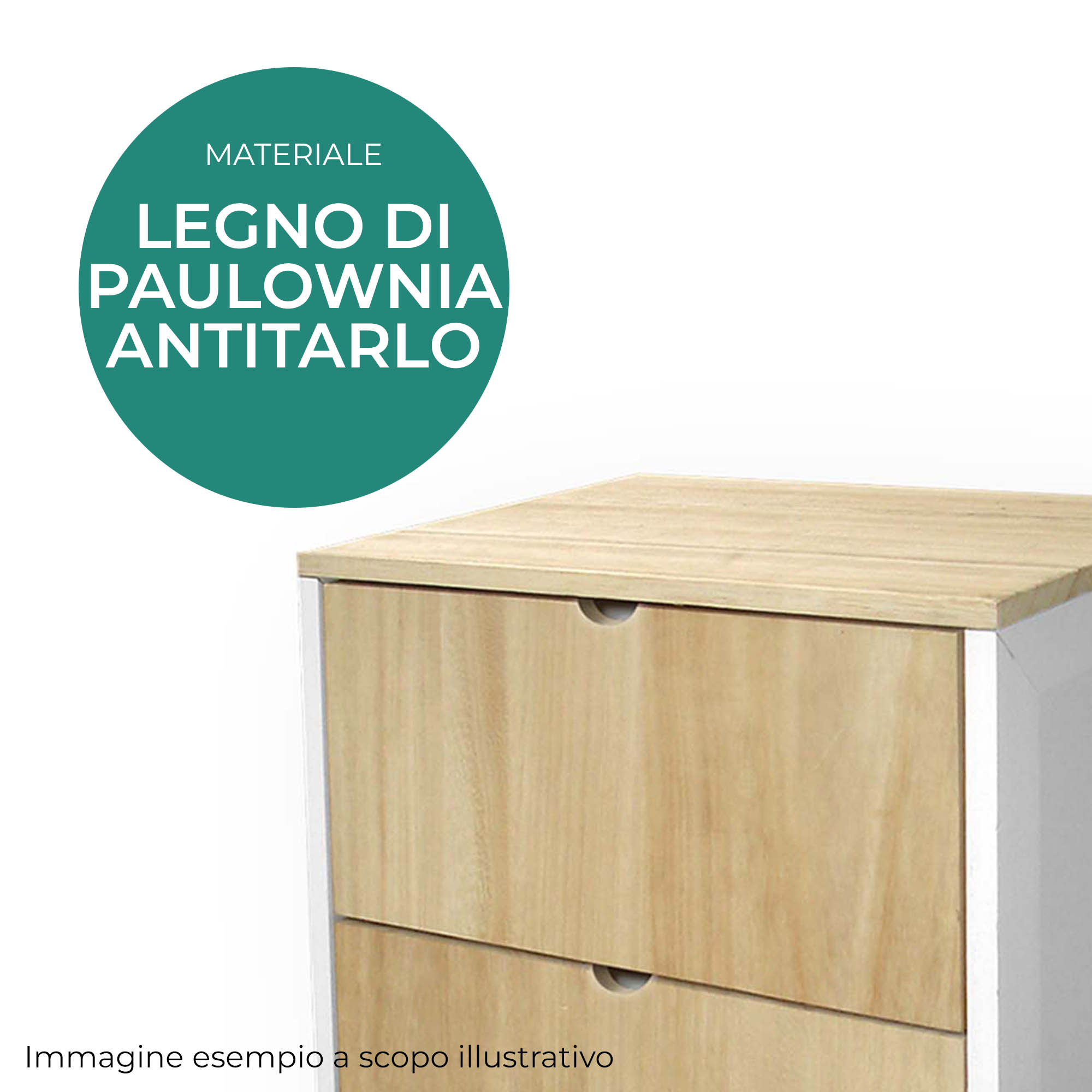 Descrizione: Cassettiera MOBILE ITALY dallo stile minimal in Legno di Paulownia antitarlo verniciato naturale, con 4 Cassetti offre spazio per organizzare i tuoi ambienti con stile moderno, adattandosi ai tuoi ambienti domestici o lavorativi. Il mobiletto arrivera' gia' montato e pronto all'uso da posizionare in qualsiasi stanza della casa, camera da letto, corridoio, cucina, soggiorno, ingresso o anche ripostiglio, per mantere in ordine gli spazi e accogliere libri, scarpe, vestiti, articoli per la casa.