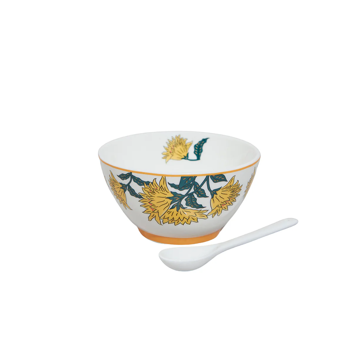 Porcellana new bone, coppetta fantasia floreale con cucchiaio, Disponibili in tre colori, Giallo,Rosso,Azzurro. Capacità 330 cc; dimensioni: coppetta, diametro cm 12, altezza cm 6,5, cucchiaio cm15