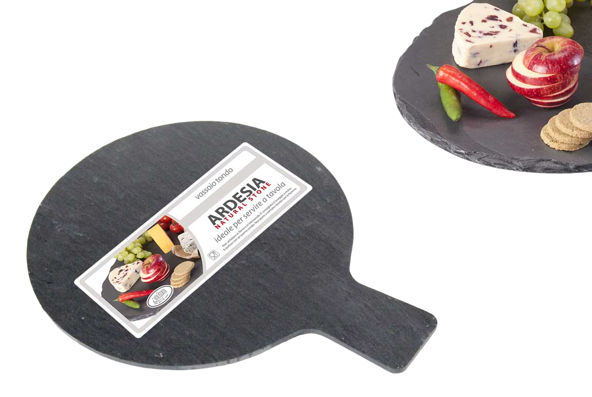 Descrizione: I piatti in ardesia sono versatili e possono essere utilizzati, ad esempio, come piatti di presentazione su buffet e come sottopiatti per servire i piatti sui tavoli da pranzo. L'ardesia naturale è un vero e proprio colpo d'occhio e può essere integrato in stili d'arredo moderni, ma anche eleganti e rustici. Le planche in ardesia naturale sono dotate di piedini in gomma e quindi non scivolano.