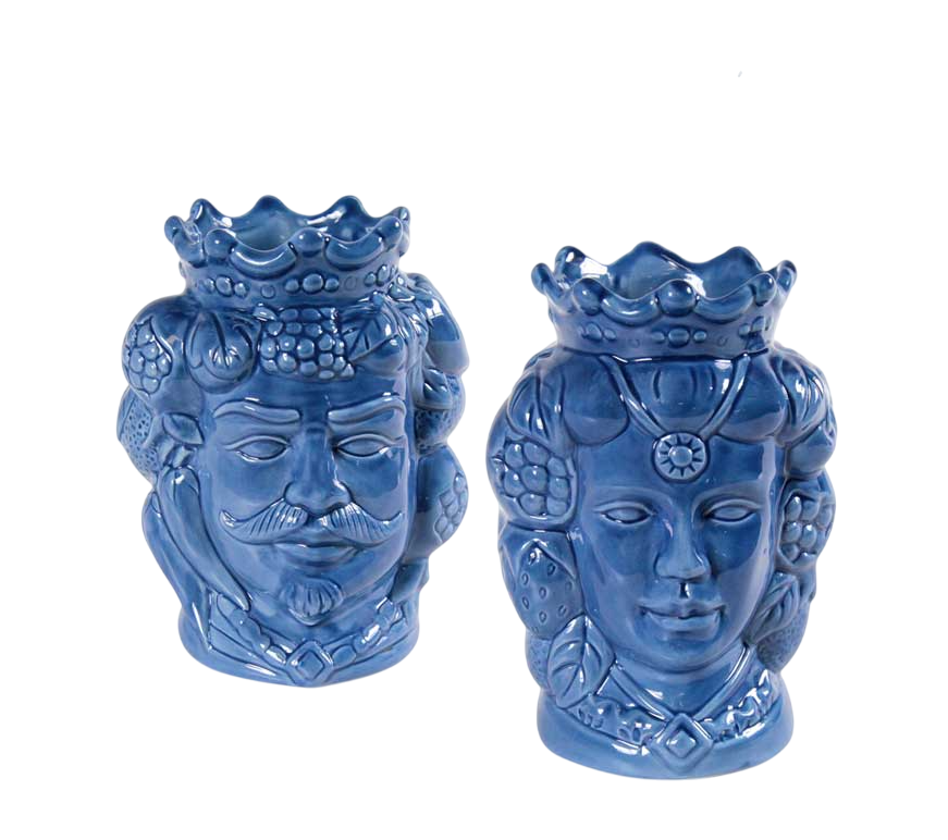 Descrizione: Una coppia di Teste di Moro è un oggetto decorativo tipico della Sicilia, realizzato in ceramica smaltata. Rappresenta due profili, solitamente un uomo e una donna, con tratti somatici che richiamano l'aspetto dei mori. Questi vasi, oltre ad avere una funzione ornamentale, simboleggiano l'amore, la passione e la gelosia, ispirandosi a una leggenda popolare siciliana.