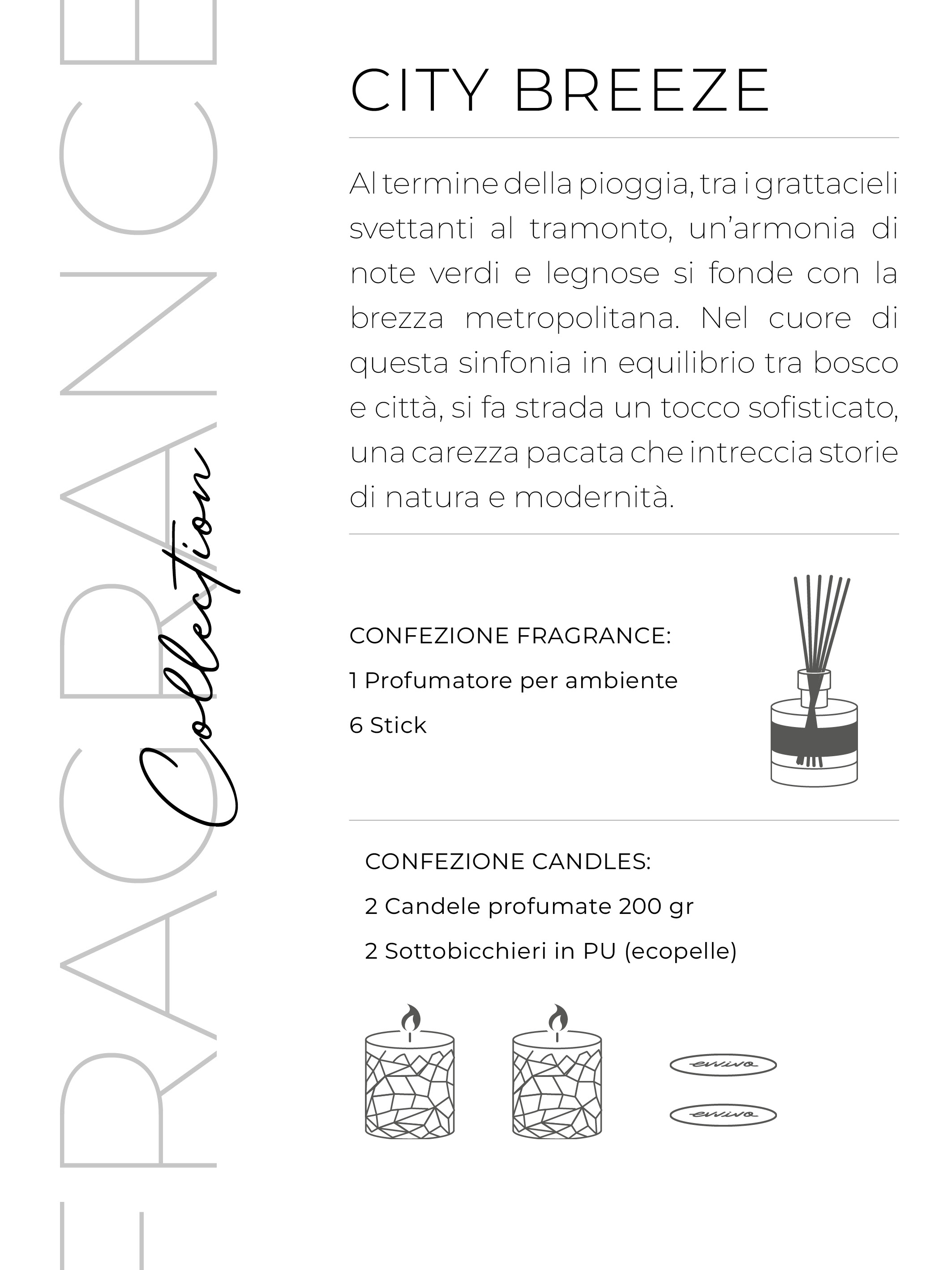 Descrizione: Al termine della pioggia, tra i grattacieli svettanti al tramonto, un'armonia di note verdi e legnose si fonde con la brezza metropolitana.