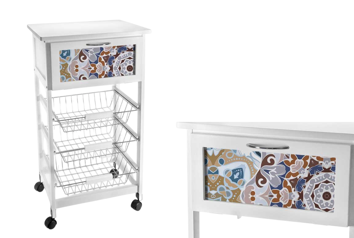Descrizione: Il carrello portafrutta mosaico è un elemento d'arredo funzionale e decorativo per la cucina o la sala da pranzo.
