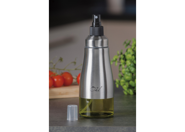 Semplice contenitore con meccanismo spray per nebulizzare olio e aceto su insalate, grigliate o per ungere teglie in modo uniforme e controllato, riducendo gli sprechi.