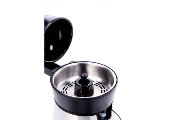 Spremiagrumi elettrico da 120W con corpo in plastica e dettagli in acciaio. Ideale per preparare facilmente spremute fresche.