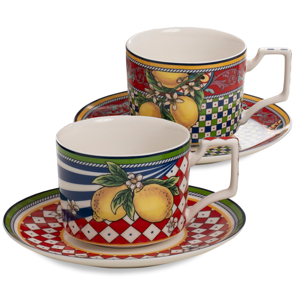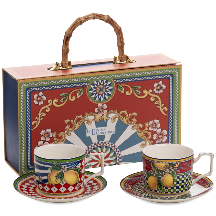 Set 2 tazze cappuccino con piattino in ceramica di finissima qualità e decoro rosso Sicilia luxury e limoni che si presentano in una elegante valigetta.